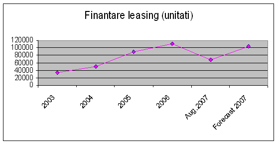 Dupa cum se prezinta in graficul de mai sus incepand cu anul 2003 finantarea prin leasing prezinta o continua crestere. De la aproximativ 40.000 de unitati finantate prin leasing in perioada anului 2003 se ajunge la un numar de unitati de peste 100.000 la jumatatea anului 2006. Se poate observa ca incepand cu cea de-a doua jumatate a anului 2006 se prezinta o scadere importanta de la 100.000 de unitati la aproximativ 70.000 de unitati in anul 2007. Anul 2007 prezinta de asemenea o crestere brusca a nivelului de finantare in sistem leasing.