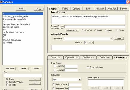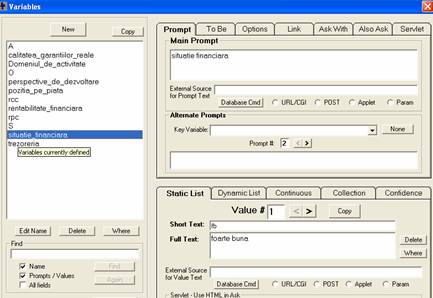 Pentru fiecare variabila introdusa se precizeaza la Main Prompt o observatie, iar pentru variabilele Static list se introduc la Full Text si la Short Text valorile posibile dupa cum se poate vedea īn figura 4.2: