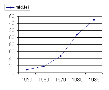 Începând cu anul 1970 atât cuantumul cât si ponderea au crescut continuu de la 46,7 miliarde lei în 1970 la 108,8 miliarde lei în 1980, ajungând la 150,6 miliarde lei în 1989.