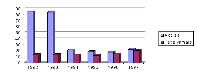 Ponderea accizelor si taxelor vamale în total impozite indirecteSe observa ca, în lipsa T.V.A., accizele au avut o pondere covârsitoare în cadrul impozitelor indirecte, însa, dupa introducerea T.V.A., ponderea acestora a scazut foarte mult. Ele se mentin totusi înaintea taxelor vamale, au un randament fiscal mai ridicat.