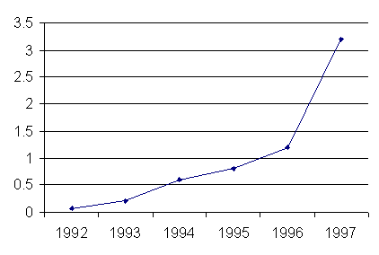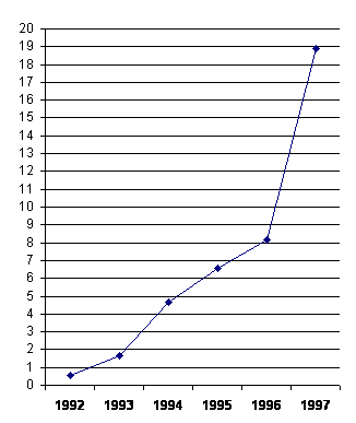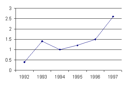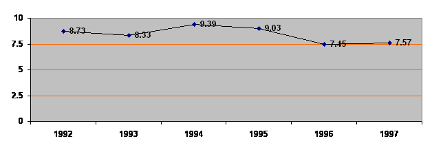 d) Evolutia grafica a accizelor în perioada 1992-1997