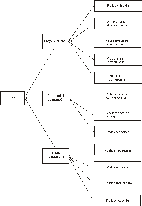 De fapt, firma intra în relatii cu mediul sau economic prin intermediul unor piete specifice, proprii economiei de piata, piete pe care actioneaza reguli sau politici specifice. Unul dintre factorii care au actiunea cea mai puternica asupra firmei (deci, inclusiv asupra finantelor firmei) este statul, mai precis, institutiile pe care statul le impune asupra vietii economice dintr-o anumita tara (inclusiv asupra relatiilor economice si financiare externe ale firmei). O reprezentare sinoptica a modalitatilor (normelor, institutiilor, politicilor) prin care statul se erijeaza în mediu economic al firmei este cea din Fig. 1.4-2: