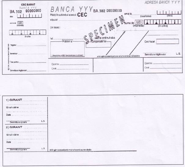 - clientul beneficiar se duce la unitatea bancara a clientului platitor si remite cecul. Functionarul de la ghiseu ii controleaza elementele obligatorii dar mai ales specimenul de semnatura al platitorului(conform punctului 1 din Anexa 2).