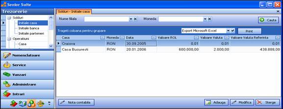 Selectarea op 858d320i tiunii Trezorerie - Solduri - Initiale casa permite utilizatorului sa vada lista casieriilor care prezinta sold initial.