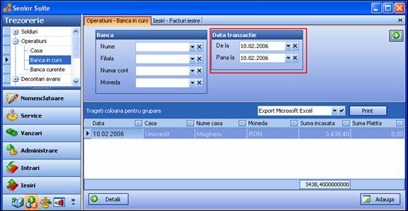 Selectand optiunea Trezorerie - Operatiuni - Banca in curs un utilizator poate sa vada operatiunile efectuate prin intermediul acestui submeniu.