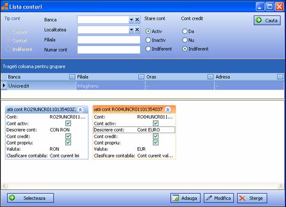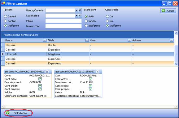 Pentru selectia unui cont se intra in fereastra Filtru cautare, in care sunt incluse detaliile conturilor.