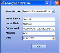 Pentru introducerea unei tranzactii noi se apasa butonul de adaugare. Acesta deschide fereastra in care trebuie completate variabilele contului in care se incaseaza sau din care se plateste.