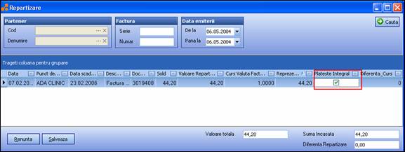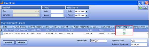 Daca se platesc integral ambele documente, se bifeaza optiunea asociata acestei actiuni si printr-un click in campul "Valoare totala" se aduce intreaga suma ce trebuie achitata, dupa aceea se salveaza.