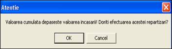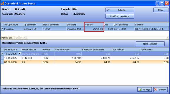 Mesajul de atentionare de mai sus apare deoarece in campul "Valoare" (de incasat) din cadrul ferestrei Operatiuni banca in curs nu s-a completat nici o suma. El va prelua valoarea totala a celor doua documente achitate integral.
