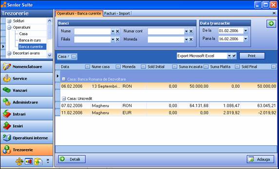 In cadrul acestui submeniu se regasesc operatiile realizate prin banca si casierie.