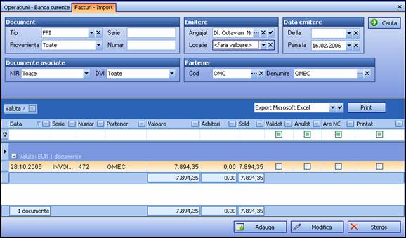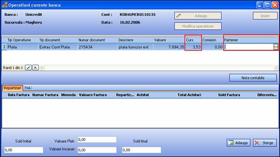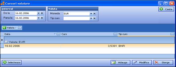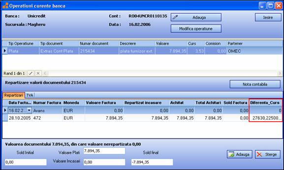 In momentul efectuarii achizitiei (28.10.2005) s-a inregistrat un curs de 3,5, iar in momentul platii (16.02.2006), cursul euro - RON s-a modificat, aplicatia permitand calculul diferentelor de curs valutar.