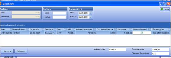 Acesta va fi ales din lista Parteneri, iar dupa selectie se va deschide fereastra Repartizare care include documentele ce trebuie achitate pentru partenerul respectiv.
