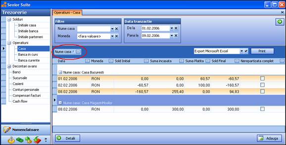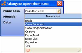 De exemplu, la adaugarea unei operatiuni prin casa se va selecta mai intai casieria la care se va realiza tranzactia.