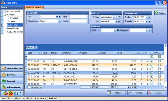 De exemplu, pentru partenerul DENT ESTET CLINI SRL exista urmatoarele facturi: