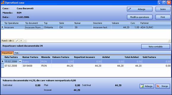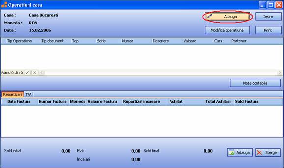 In fereastra Operatiuni - Casa se va inregistra efectuarea incasarii, dupa apasarea butonului "Adauga".