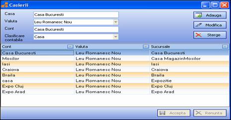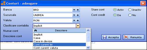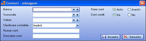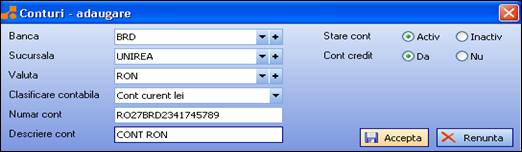 Pentru salvarea datelor si preluarea noului cont in lista se apasa butonul "Accepta", in caz contrar butonul "Renunta".
