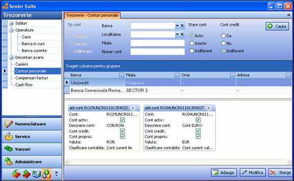 Conturile detinute de catre firma la banci pot fi vizualizate selectand optiunea Trezorerie - Conturi personale.