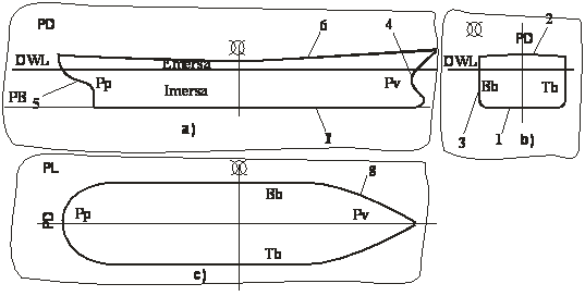 Conturul corpului navei in planul diametral este definit de urmatoarele linii: