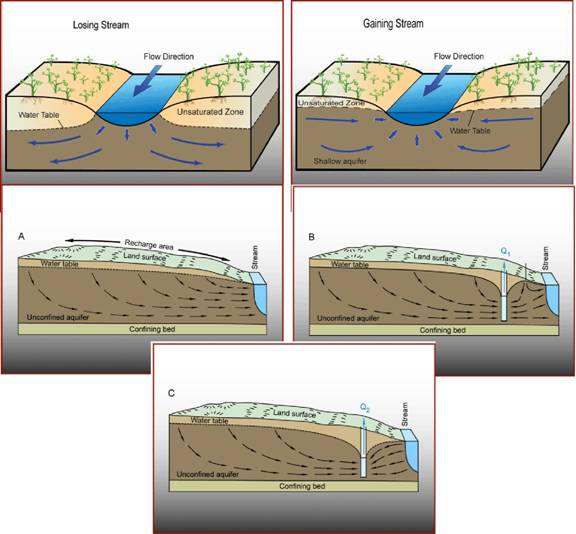 Alimentarea râurilor cu apa provenita din acviferele freatice - în perioadele cu deficit de umiditate apa subterana poate constitui o importanta sursa de alimentare a retelei hidrografice.