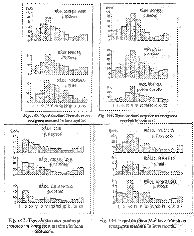 Tipul pontic si tipul panonic - situate în Dobrogea si în Câmpia de Vest, scurgerea se caracterizeaza prin debite medii mari la sfârsitul lunii februarie, apoi apele mici persista aproape tot cursul anului. Râurile de tip panonic, în unele primaveri, pot prezenta viituri cu caracter brutal. La râurile pontice, viiturile se produc în general în lunile de vara (Casimcea, Topolog, Slava, Telita, etc.);