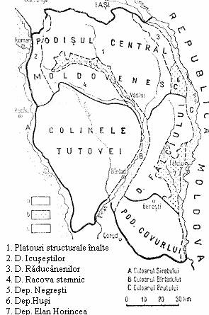 Fig.7. Subunitatile Podisului Barladului. a. Dealuri, coline; b- depresiuni; c- culoare depresionare. |