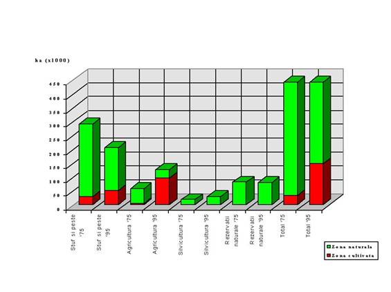 Astfel, cel mai evident motiv pentru declinul populatiilor de pasari de apa este pierderea habitatelor din terenurile umede, prin convertirea acestora la alte utilizari, cum ar fi agricultura si silvicultura. In acest sens, s-a produs deja o convertire substamtiala a mlastinilor cu apa dulce în terenuri agricole si ferme piscicole (grafic 1).