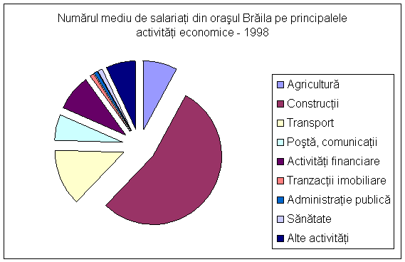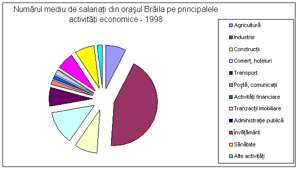 Studiind cele doua tabele care cuprind numarul mediu de salariati din municipiul Braila, pe principalele activitati economice se observa ca între anii 1994 si 1998 cel mai mare numar de someri provine din sectorul industrial unde numarul de salariati a scazut de la 43.793 (1994) la 28.574 salariati (1998), numarul persoanelor ocupate în industrie reducându-se aproape de jumatate. Asemanator este cazul persoanelor ocupate în sectorul constructiilor; în acest caz numarul salariatilor a scazut la jumatate, de la 10.777 persoane active în 1994 la 5.618 în anul 1998. Un numar important de someri provine din sectorul agricol, al transporturilor, dar si domeniul sanatatii.
