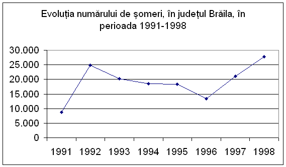 Tabel nr. 11: Evolutia numarului de someri în cadrul judetului Braila, în perioada 1991 – 1998