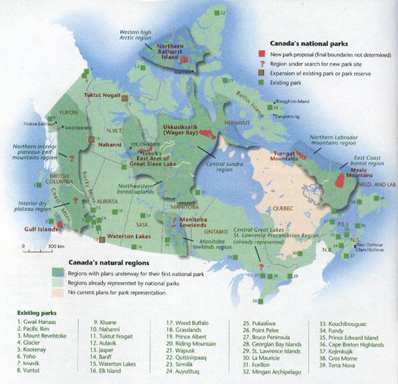 Pe tot cuprinsul ei se afla nu mai putin de 34 de parcuri si rezervatii naturale, concepute pentru a conserva si proteja natura precum si diferitele specii de plante si animale, multe dintre ele aflate pe cale de disparitie. Suprafeta acestora este variata, cea mai mare avand 44.807 km patrati iar unele, dintre cele mai mici, ajungand la numai 5,9 km patrati. In total Parcurile Nationale acopera aproximativ 180.500 km patrati, suprafata mai mare decat a Angliei, insa numai 1,8 % din suprafata totala a Canadei.In cadrul acestor parcuri au fost cuprinse si vaste intinderi de ape, cum sunt Fathom Five Natinal Marine Park si insule ce constituie camine pentru pasari si animale marine ca Funk Island si Bylot Island. Majoritatea acestor parcuri si rezervatii naturale au fost infiintate pentru a protej 838f53i a habitatul natural al diverselor specii de animale, pasari, plante si chiar structuri geologice.