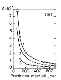 Influenta presiunii asupra compresibilitatii sistemului de microfisuri, fisuri si caverne din rocile carbonatice este data n figura 8.1., pentru doua calcare cu porozitatile: (1) 2,01% si (3) 11,31% si o marna cu porozitatea (2) 2,63%.