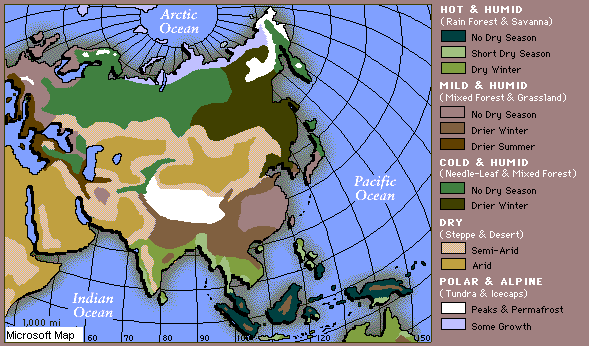 Marginile sudice si vestice ale continentului sunt caracterizate de atmosfera musonica ,care trece prin interiorul rece sudic si estis al iernii.