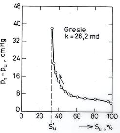O prima observatie este aceea ca la aceeasi saturatie Su, diferenta capilara de presiune este mai mica la cresterea saturatiei Su decāt la scaderea ei. Daca patrunderea fazei neumezitoare este conditionata de exercitarea unei presiuni exterioare, patrunderea fazei umezitoare se face īn mod spontan prin ceea ce se numeste īmbibare libera. Un bun exemplu de īmbibare libera este cel studiat īn capitolul 11, anume ascensiunea capilara īntr-un fascicul de capilare sau īntr-un dublet de pori. Īmbibarea spontana este inhibata de doua fenomene: primul este histereza de udare care, asa cum s-a aratat īn capitolul 13, face ca o faza care este dezlocuita sa ude mai bine decāt atunci cānd ea dezlocuieste. Astfel, contrastul de umidivitate īntre cele doua faze scade īn cazul procesului de imbibare. Īn aceste conditii curba de presiune se deplaseaza spre abscisa, asa cum s-a aratat mai sus, cānd s-au discutat curbele din figura 15.2. O a doua explicatie se refera la faptul ca la schimbarea sensului de variatie a saturatiei, ordinea de patrundere a fazei umezitoare īn diversi pori nu este inversa ordinii de iesire din mai multe motive. Cauza care se poate intui cel mai usor este faptul ca o mare parte din constrictiile īn care s-au format dopuri de faza umezitoare ramān blocate, microgradientii de presiune din zona acestor pori fiind insuficienti pentru punerea lor īn miscare. La fel, poate fi invocat procesul care are loc īntr-un dublet de pori la schimbarea sensului presiunii. Astfel, la aceeasi diferenta capilara de presiune, saturatia īn faza umezitoare este mai mica deoarece o anumita cantitate de faza neumezitoare ramāne blocata īn vecinatatea dopurilor de faza umezitoare din aceste microcapcane capilare.