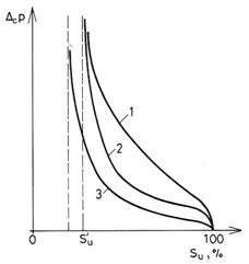 Modul īn care variaza diferenta capilara de presiune cu saturatia sau, altfel spus, alura curbei de presiune capilara depinde īntr-o masura importanta de toate marimile care intervin īn expresia diferentei capilare de presiune: tensiunea interfaciala, contrastul de umidivitate, distributia porilor pe dimensiuni. Membrul drept al relatiei (15.1.) cuprinde, explicit sau implicit acesti parametri. Pentru a ilustra modul cum se modifica alura curbelor de presiune capilara īn functie de acestia, īn figura 15.2. este sunt prezentate trei curbe de presiune capilara: doua (I si II), ambele pentru o tensiune interfaciala mare si pentru un contrast mare de umidivitate īntre faze dar pentru o retea de pori cu un grad mare de uniformitate dimensionala (II), respectiv pentru un grad mare de neuniformitate dimensionala (I); a treia curba (III) este specifica unei tensiuni interfaciale mici si unui contrast mic de umidivitate (faza dezlocuita fiind, totusi, cea umezitoate), influenta uniformitatii distributiei poromeritice fiind de ordin secundar īn acest caz. De mentionat ca intervalul de frecventa maxima a dimensiunii porilor este acelasi pentru toate cele trei curbe, diferit fiind doar gradul de uniformitate.