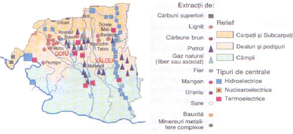 Relieful din partea de sud a regiunii favorizeaza agricultura, Oltenia fiind una din regiunile agricole traditionale din România. Reteaua hidrologica, alaturi de configuratia reliefului, confera regiunii rolul energetic principal în România (71,57% din totalul productie hidroelectrice, cu un total de 10.363,39 GWh în 2001), prin exploatarea potentialului apelor curgatoare care traverseaza regiunea : fluviul Dunarea, râurile Jiu si Olt. Pe teritoriul Olteniei se afla complexele hidroenergetice Portile de Fier (printre cele mai mari din Europa) - judetul Mehedinti si Lotru-Olt - în judetul Vâlcea (printre cele mai mari din România). Mai mult, aproape de zonele miniere Motru - Valea Jiului, functioneaza doua din cele mai mari centrale termoelectrice din România: Rovinari si Turceni. Importanta Olteniei în productia nationala de energie este ilustrata în tabelul 1.2 de mai jos. Asa cum se poate vedea, regiunea detine 27% din totalul productiei termoelectrice si 71,5% din totalul productiei de energie hidroelectrica a României.