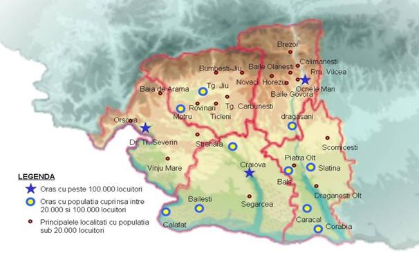Populatia urbana este concentrata în special in cele cinci resedinte de judet care totalizeaza împreuna 66,32% din populatia urbana a regiunii (tab. 1.4). Alte centre importante sunt municipiul Caracal - ex-resedinta a fostului judet Romanati si un numar de orase cu structura de mono-industrie incluzând Slatina (industria aluminiului, municipiul Motru (industria miniera) si orasul Rovinari (energie termica).