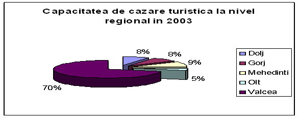 Sursa: Anuarul Statistic al României, 2004 Diferenta mare între Dolj si celelalte patru judete privind înscrierile în învatamântul superior, si numarul angajatilor in activitatea de cercetare-dezvoltare se datoreaza existentei unui puternic centru universitar în Craiova, cunoscut ca al 2-lea cel mai important centru cultural din sudul României dupa Bucuresti. Disparitati evidente între cele cinci judete ale Olteniei se înregistreaza în sectorul turismului. Exista discrepante enorme între capacitatea de cazare a judetului Vâlcea si a celorlalte 4 judete: 70% din întreaga capacitate de cazare a regiunii Oltenia se gaseste in Vâlcea. Aceasta situatie este determinata de numarul mare al statiunilor balneo-climaterice din muntii judetului Vâlcea, cu ape minerale si o infrastructura buna în domeniul terapiei medicale. Judetele Gorj si Mehedinti sunt cunoscute mai ales pentru turismul rural si montan, însa infrastructura hotelurilor nu este foarte dezvoltata. Mehedinti, Dolj si Olt au o buna oportunitate de dezvoltare datorita fluviului Dunarea, dar turismul în regiunea fluviala este doar planificat a se dezvolta, singura parte a Dunarii suficient de bine dezvoltata pentru turism din România fiind Delta. Municipiul Craiova, unul dintre cele mai vechi orase din România si unul dintre cele mai importante centre culturale ale tarii, atrage mai putin turisti decât ar putea oferi potentialul sau, fiind izolata în mijlocul câmpiei Olteniei, relativ departe de zonele turistice traditionale.