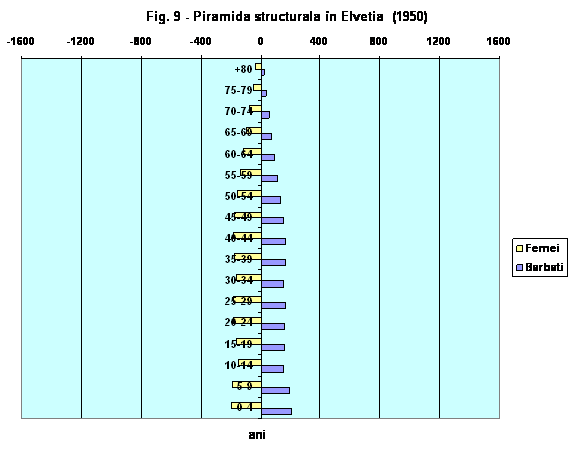 În ceea ce priveste structura pe grupe de vârste si sexe în Elvetia, intervalul 0-4 în anul 1950 este cel mai dezvoltat, atât în cazul populatiei de gen masculin, cât si cea de gen feminin, cel de-al doilea esantion fiind mai putin numeros decât primul. Se observa ca cea mai mare parte a populatiei apartine vârstei tinere si mature (0-49 ani). Piramida nu prea are forma de triunghi, deoarece exista un numar aproape constant al populatiei pe toate categoriile de varsta , natalitatea nu este foarte ridicata pentru a avea la baza piramidei o baza extinsa, flancuri convexe si vârf ascutit, datorita faptului ca numarul vârstnicilor este destul de redus.