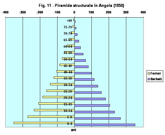 În cazul Angolei în anul 1950, situatia se prezinta astfel: intervalul 0-4 înregistreaza cele mai mari valori în ambele situatii.se observa o preponderenta în cazul populatiei adulte de sex feminin.
