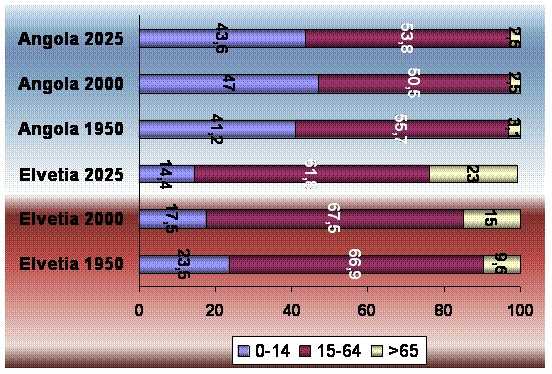 67,5 în anul 2000 si se crede a fi de 61.8% în 2025. Cea mai mica pondere o are populatia vârstnica (de 9.6% în 1950) situatie care se preconizeaza a se schimba pâna în 2025 cand vom avea (23%) populatie varsnica – tendinta de îmbatrânire demografica. Populatia tânara are o evolutie descendenta procentual datorita scaderii natalitatii si a cresterii sperantei de viata la nastere. În cazul Angolei remarcam predominanta populatiei adulte, o tendinta de echilibru a populatiei vârstnice, dar cu un procent foarte mic comparativ cu celelalte grupe de varsta datorat mortalitatii ridicate, si o crestere semnificativa a populatiei tinere, dubla, aproape tripla ca procent în comparatie cu cea a Elvetiei (fig. 13, vezi infra).