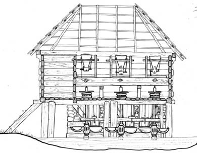 macinat, actionate fiecare de cate o ciutura, o roata hidraulica orizontala cu