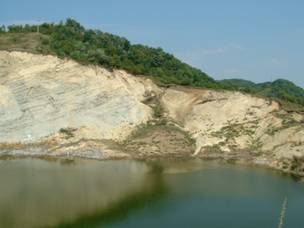Ocnele Mari: secțiune geologică a prăbușirii și lacul rezultat în urma prăbușirii (august 2003)