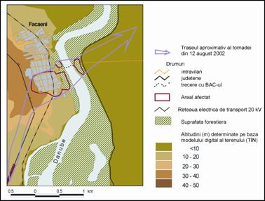 Traseul tornadei din 12 august 2002 în perimetrul Fetești-Făcăeni