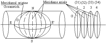 Din a doua categorie, pentru tara noastra a fost folosita "proiectia Gauss". Reprezentarea elipsoidului se face n acest caz prin zone denumite fuse av nd n general 6° pe longitudine. Meridianul origine, numit si "meridian 0", este cel care trece prin Observatorul Greenwich. Facilitatile acestei proiectii constau n aceea ca permite reprezentarea ntregului glob pe zone cuprinse ntre cei doi poli.