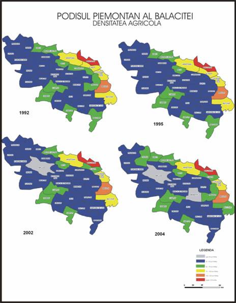 Densitatea agricola este data de raportul dintre numarul de locuitori si suprafata agricola a unui teritoriu si se exprima în locuitori pe 100 ha teren agricol. Acest indicator reflecta modificarile aparute în numarul de locuitori si suprafata agricola. Pentru a evidentia acest fenomen si evolutia sa în timp au fost preluate si prelucrate date statistice înregistrate în anii 1992, 1995, 2002 si 2004. În cadrul evolutiei densitatii agricole se pot determina 4 categorii de evolutii: scadere se înregistreaza în Balacita, Bâcles, Breznita Motru, Dumbrava, Padina, Poroina Mare, Prunisor, Vladaia, Brabova, Carpen, Cernatesti, Cotofenii din Dos, Grecesti, Gogosu, Radovan, Salcuta, Seaca de Padure, sopot, Terpezita, Vela, Verbita, Vârtop,Vârvoru de Jos; fluctuatii – scadere urmata de crestere (Greci, Livezile, Tâmna, Argetoaia, Botosesti Paia, Orodel, Predesti, Scaesti, Secu) si crestere urmata de scadere (Bucovat si Bralostita); crestere: Breasta. Valoarea maxima este înregistrata în comuna Bralostita în anul 2002, fiind de 136,55 loc/100ha, datorata cresterii efectivului demografic. Valoarea minima este de 22,87 loc/100ha, în anul 2004, în comuna Bâcles, fapt datorat scaderii numarului de locuitori ai unitatii administrative respective. Valoarea acestui indicator demografic este influentat atât de evolutia numarului de locuitori, cât si de cresterea sau scaderea suprafetelor agricole.