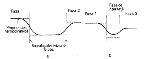 Figura 11.1,a reprezinta o schematizare a profilului unei proprietati ter-modinamice (potential chimic, energie interna, entalpie etc.) cānd grosimea fazei de interfata este atāt de mica īncāt regiunile neomogene adiacente fazelor volumice se īntrepatrund.