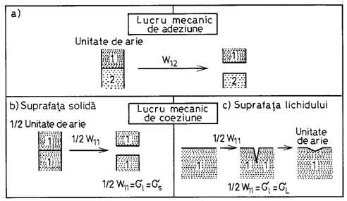 Lucrul mecanic de adeziune reprezinta variatia energiei libere sau lucrul mecanic reversibil, W12, efectuat pentru a separa o suprafata de arie unitara a doua faze în contact, sub vacuum perfect (fig. 12.1,a). Daca separatia se face în acelasi mediu, acesta se numeste lucru mecanic de coeziune, W11 (fig. 12.1,b). Trebuie subliniat faptul ca toate mediile se atrag reciproc sub vacuum, asa încât W11 si W12 sunt totdeauna marimi pozitive. Daca faza 1 este solida iar faza 2 este fluida, W12 se noteaza cu WSL.