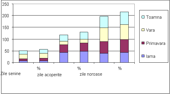 Fig. nr.10 Numarul si frecventa (%) medie anotimpuala a zilelor senine, acoperite, noroase la Vaslui(1961-1998)
