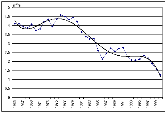 intermediul mediilor glisante, din 10 în 10 ani, în perioada 1965-2006, pe râul