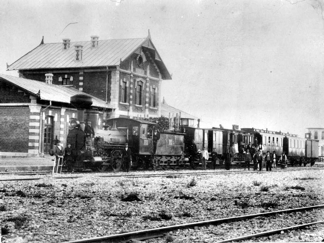 In fata garii Moinesti (cladire identica cu gara Odobesti), un tren de calatori remorcat de locomotiva 575 Magureni (Steg 1405/1874). Dupa locomotiva un tren de calatori, primul vagon este unul de "bagagiu".....Probabil fotografia este anterioara anului 1904, locomotiva neavand pe marchiza placuta cu "iuteala maxima". Initial garile Moinesti , Pucioasa si Odobesti au fost identice fiind proiectate si construite de renumitul inginer roman Elie Radu.