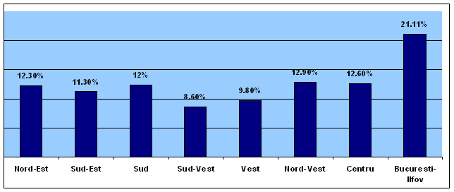 Fig. 2.1 Ponderea PIB regional fata de media nationala - comparatie intre regiuni.